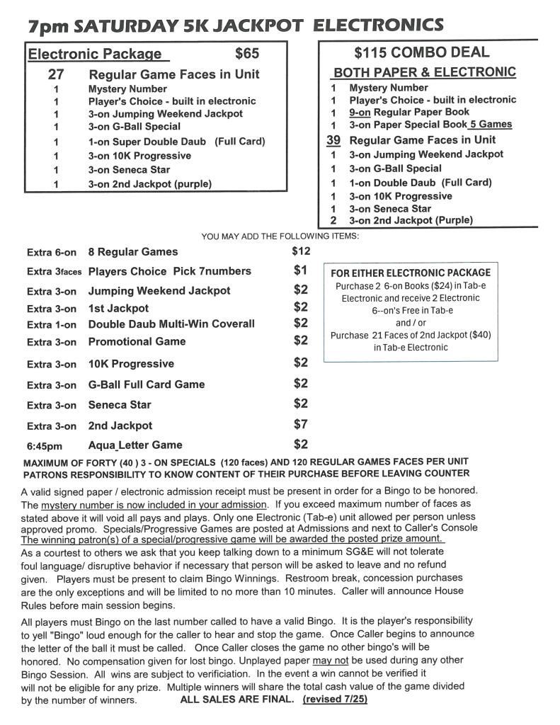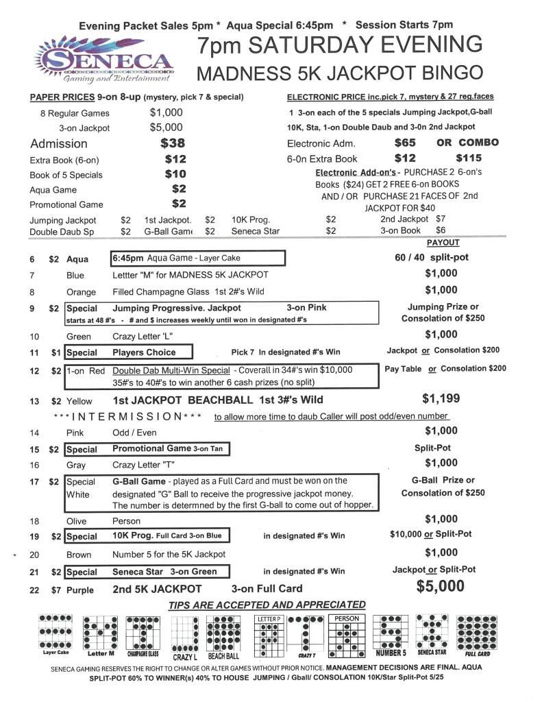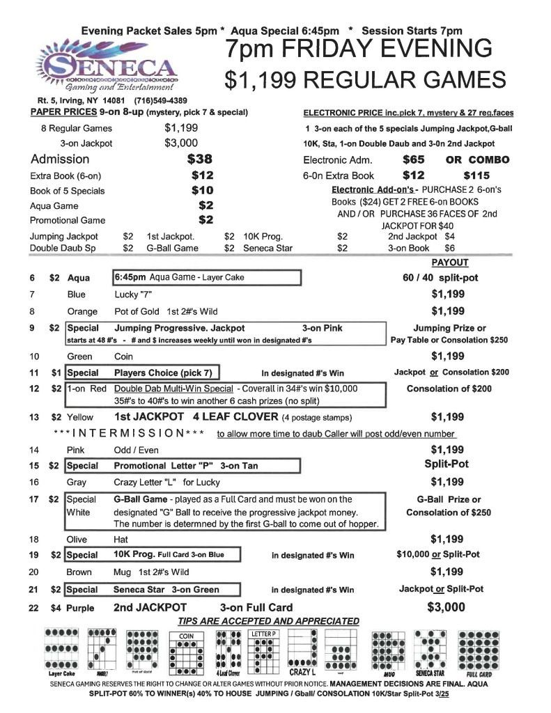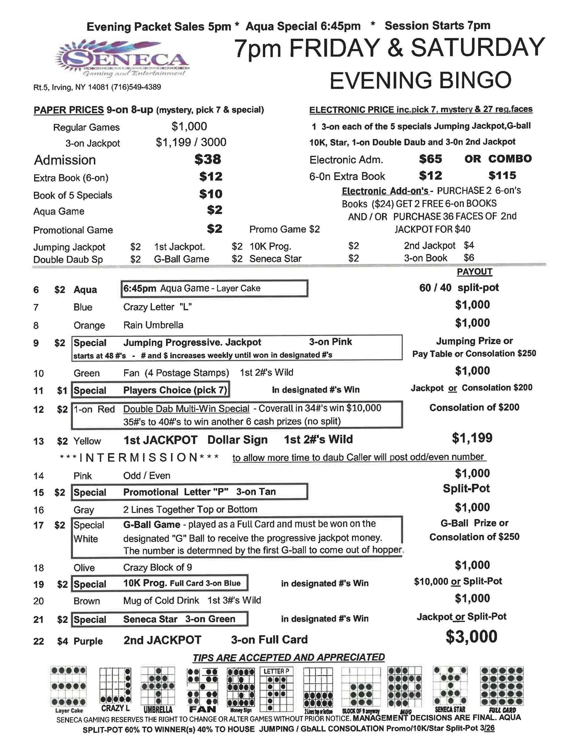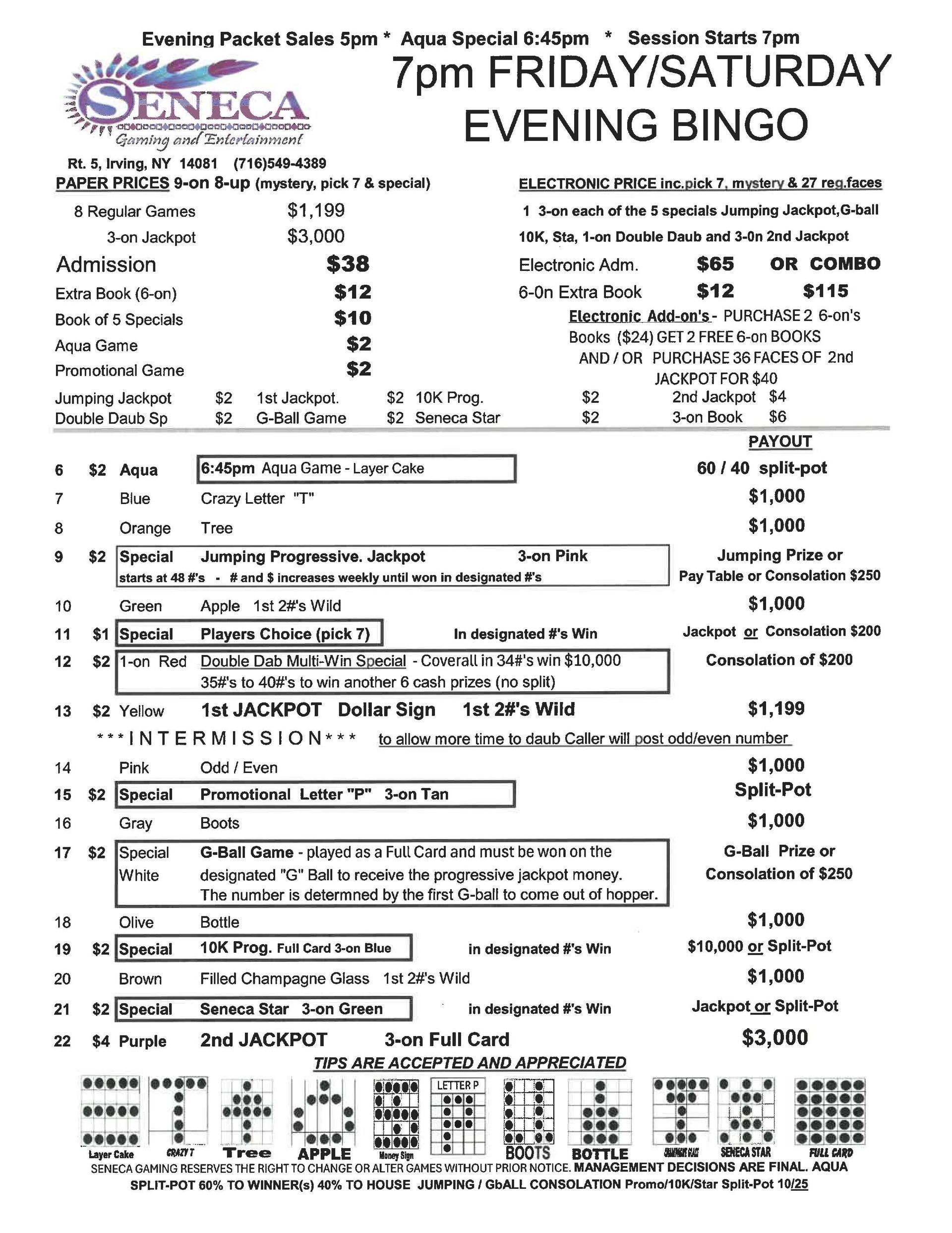| 7pm Friday & Saturday Bingo | $38 Admission | $65 | $1000 | $3000 |