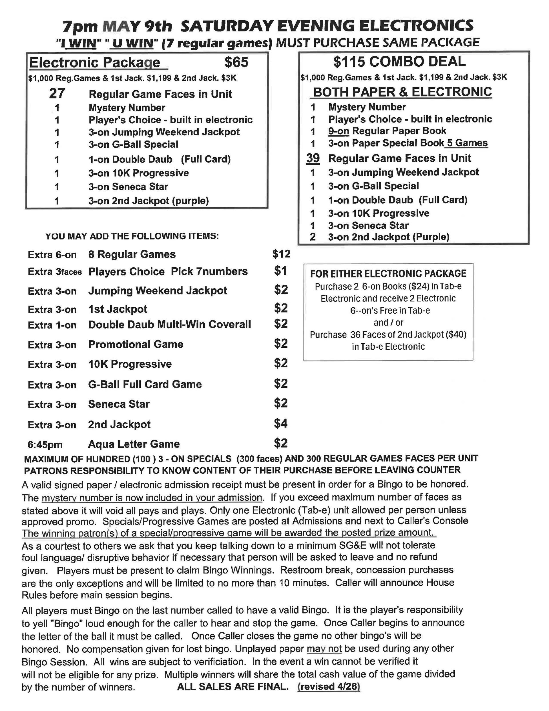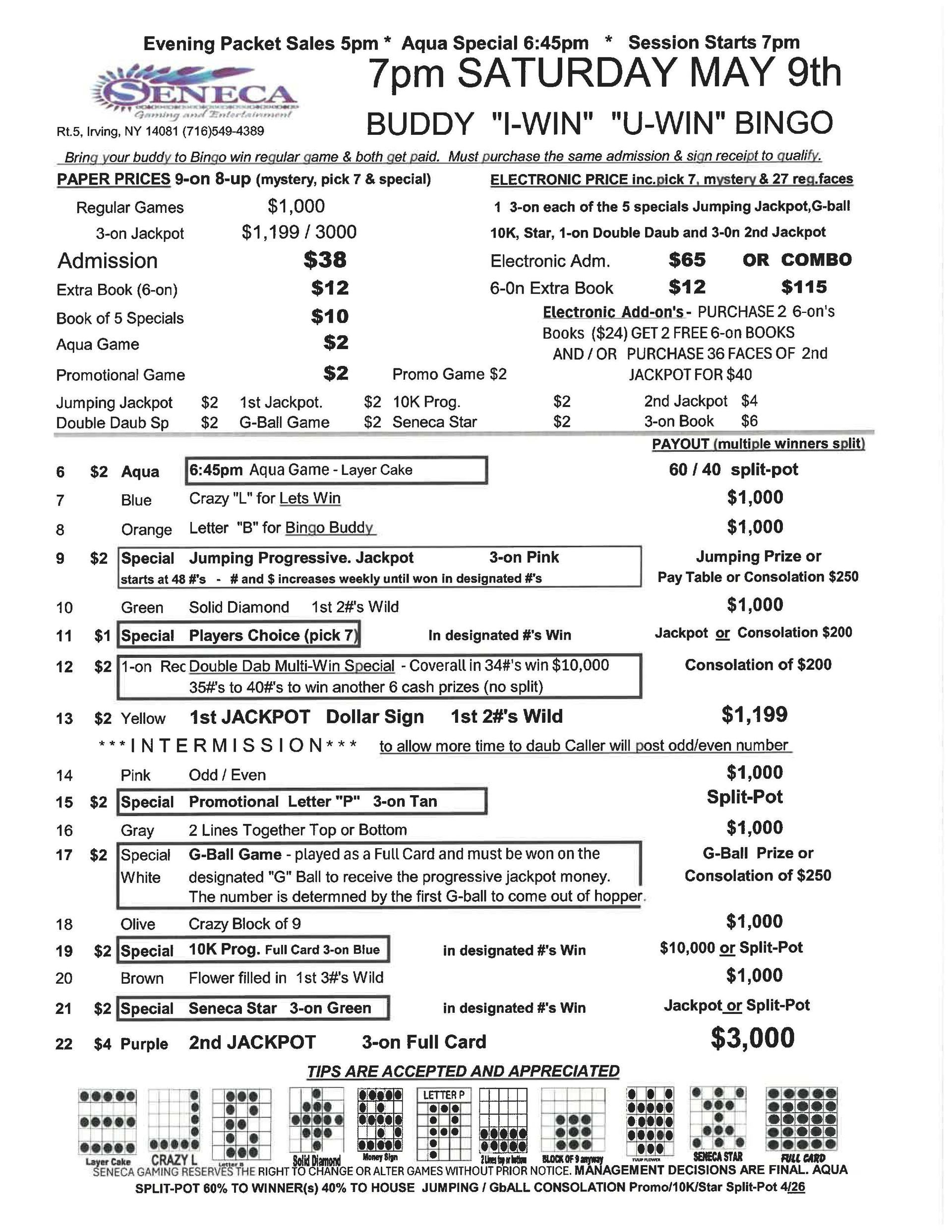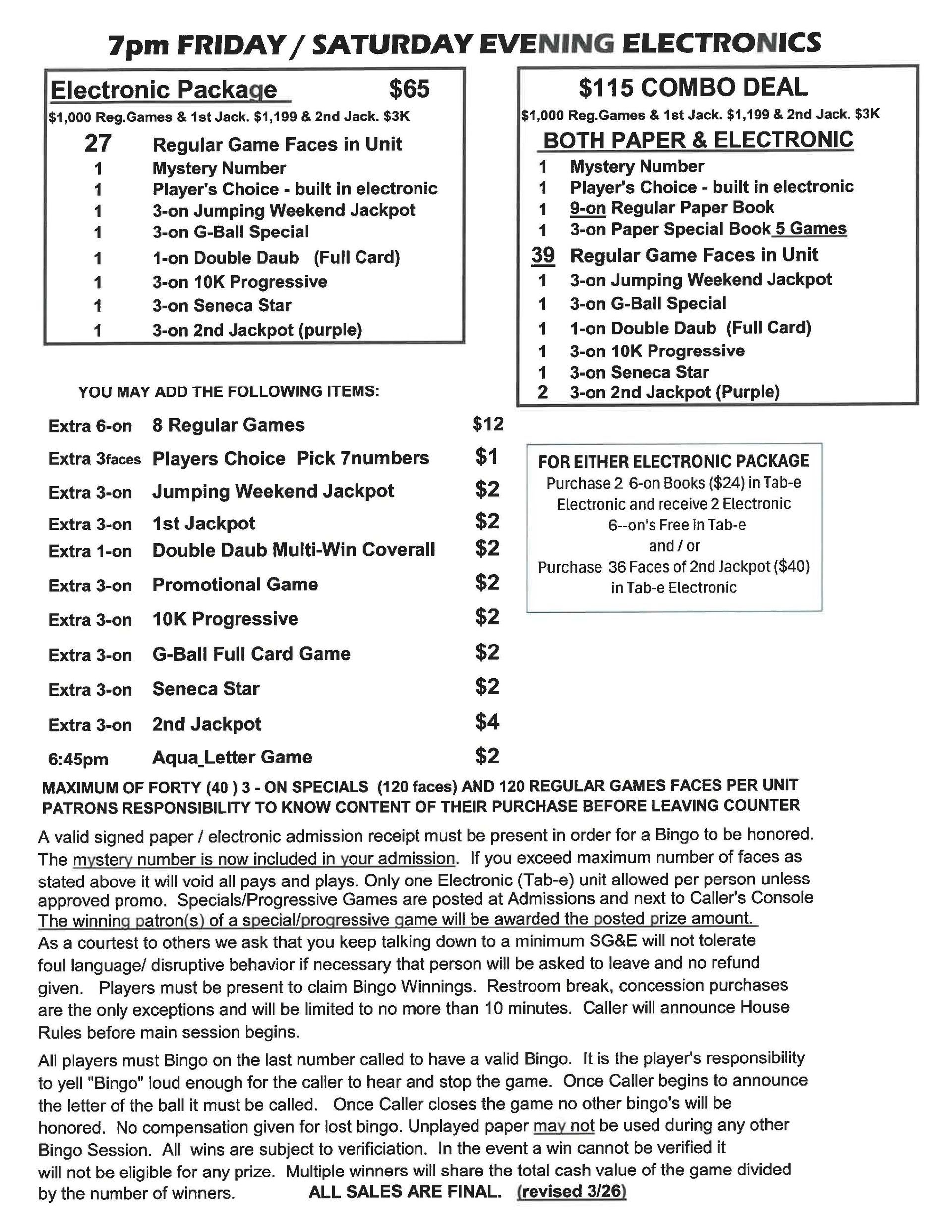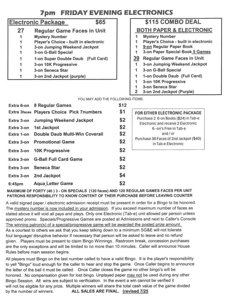 | 7pm Friday & Saturday Bingo | $38 Admission | $65 | $1000 | $3000 |