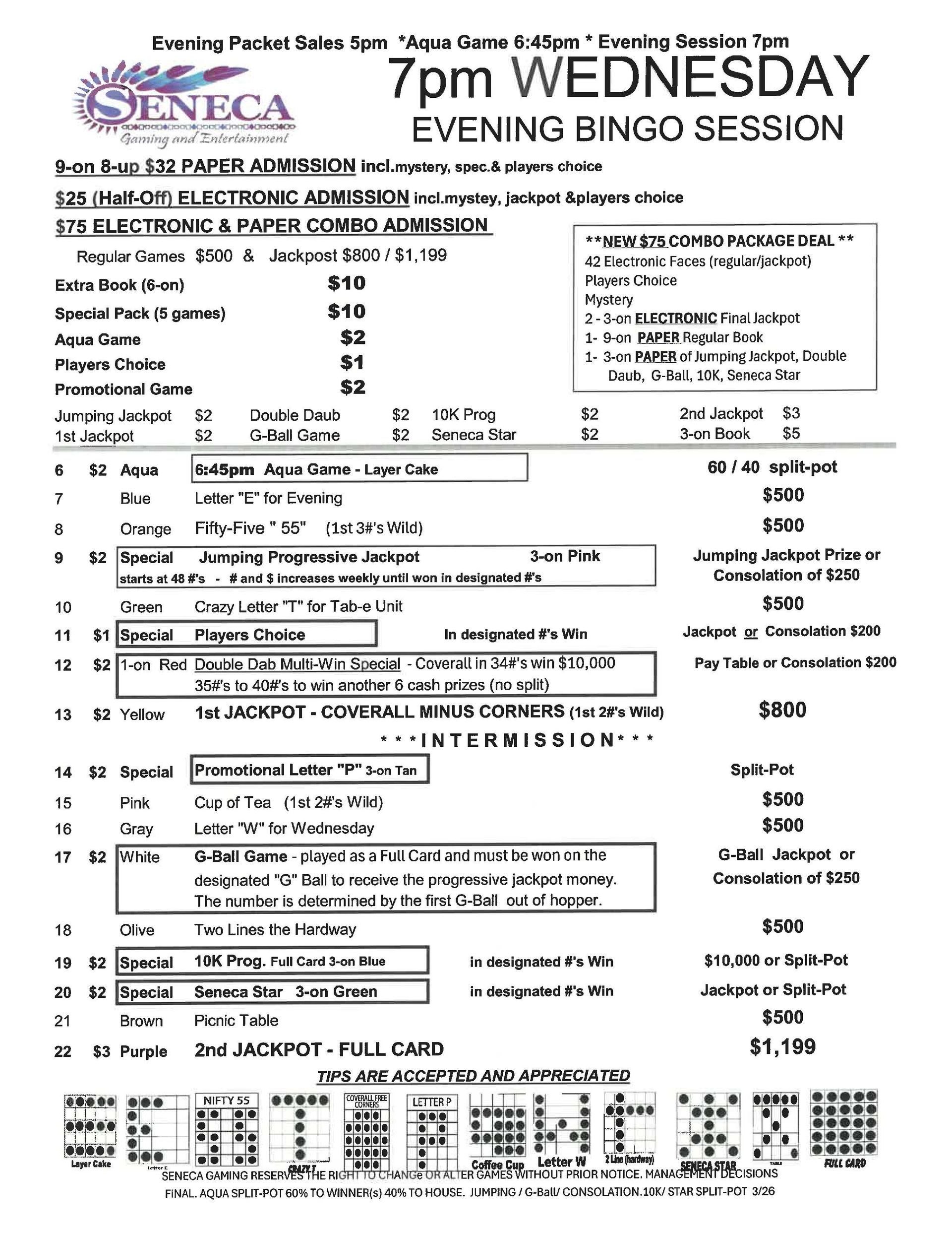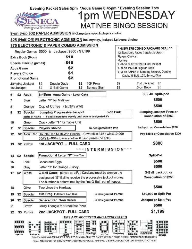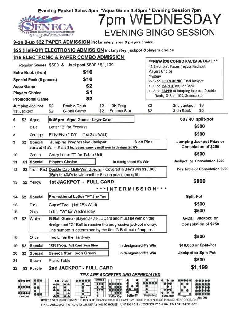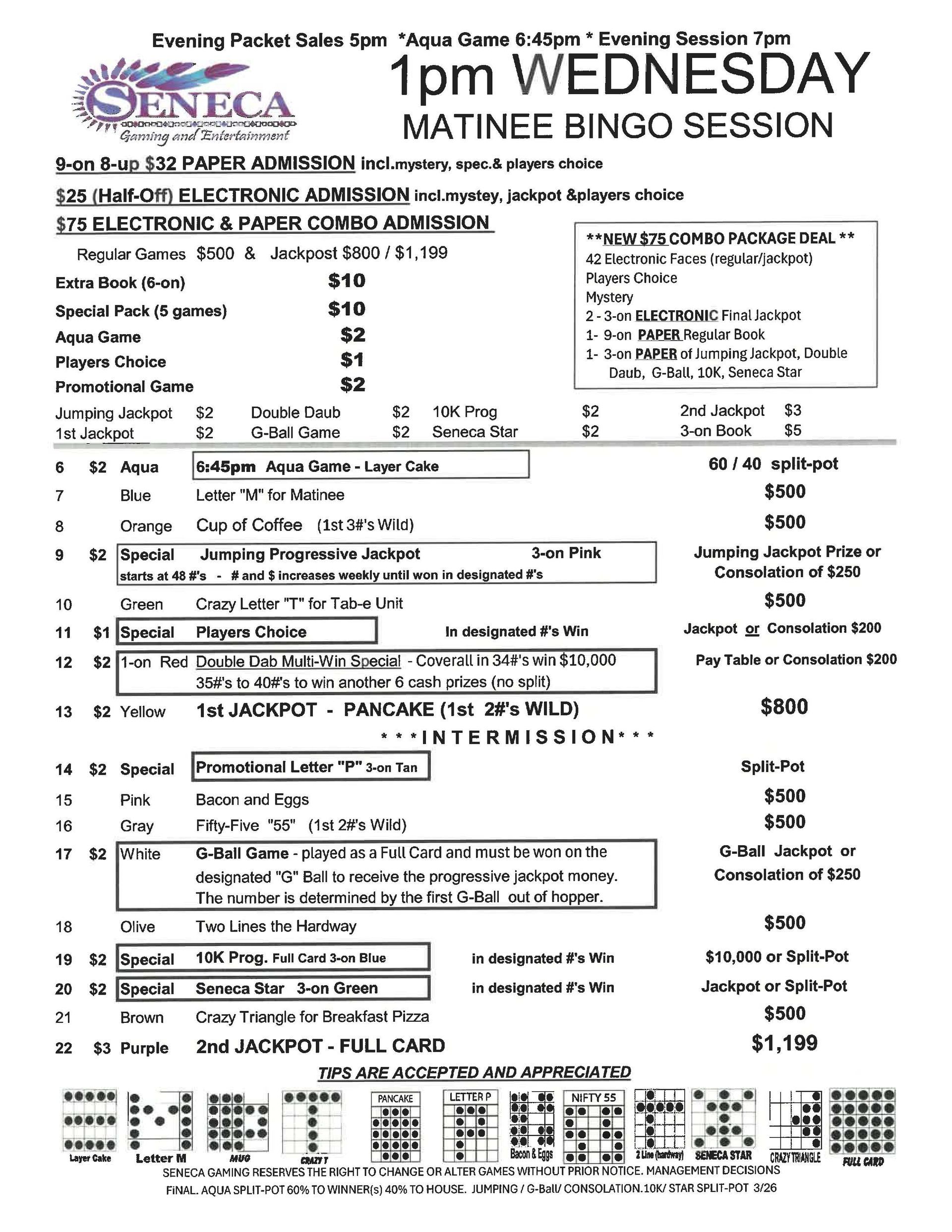| 1pm & 7pm Wednesday Bingo | $32 Admission | $25 | $500 | $1,199 |