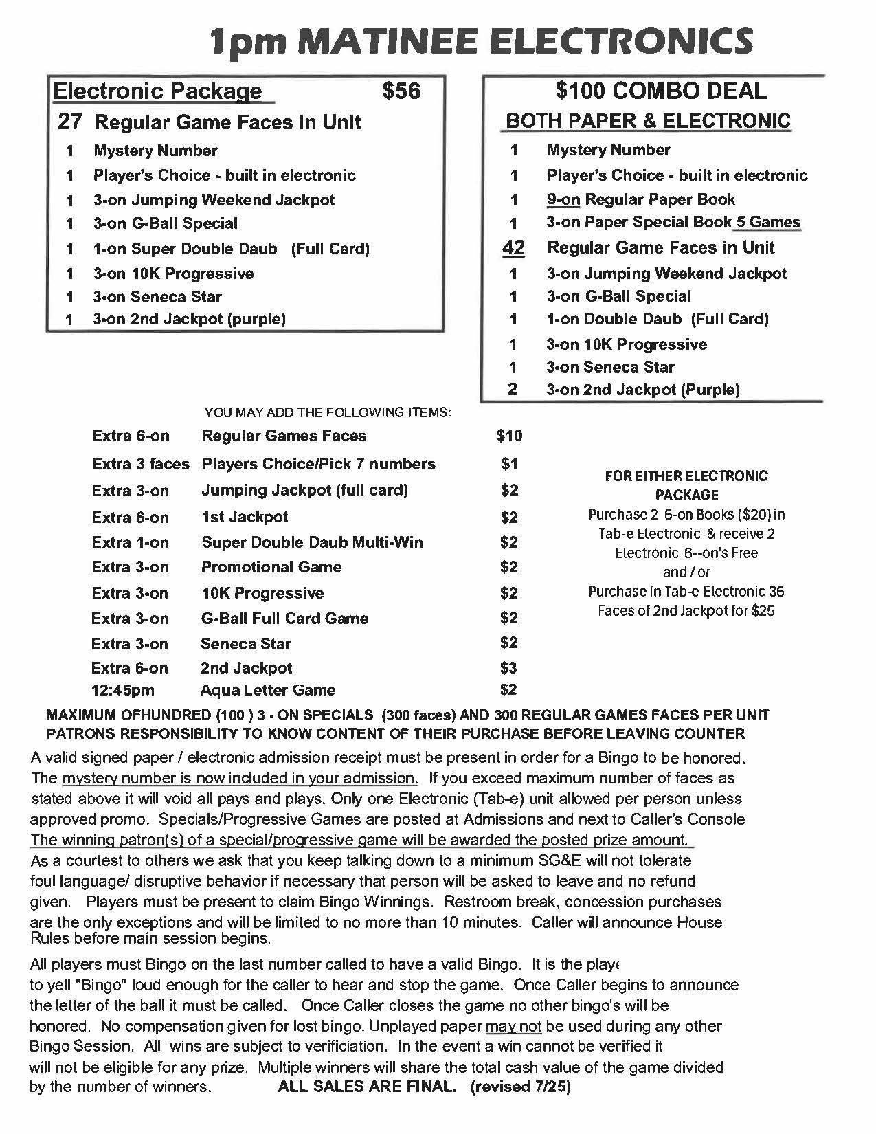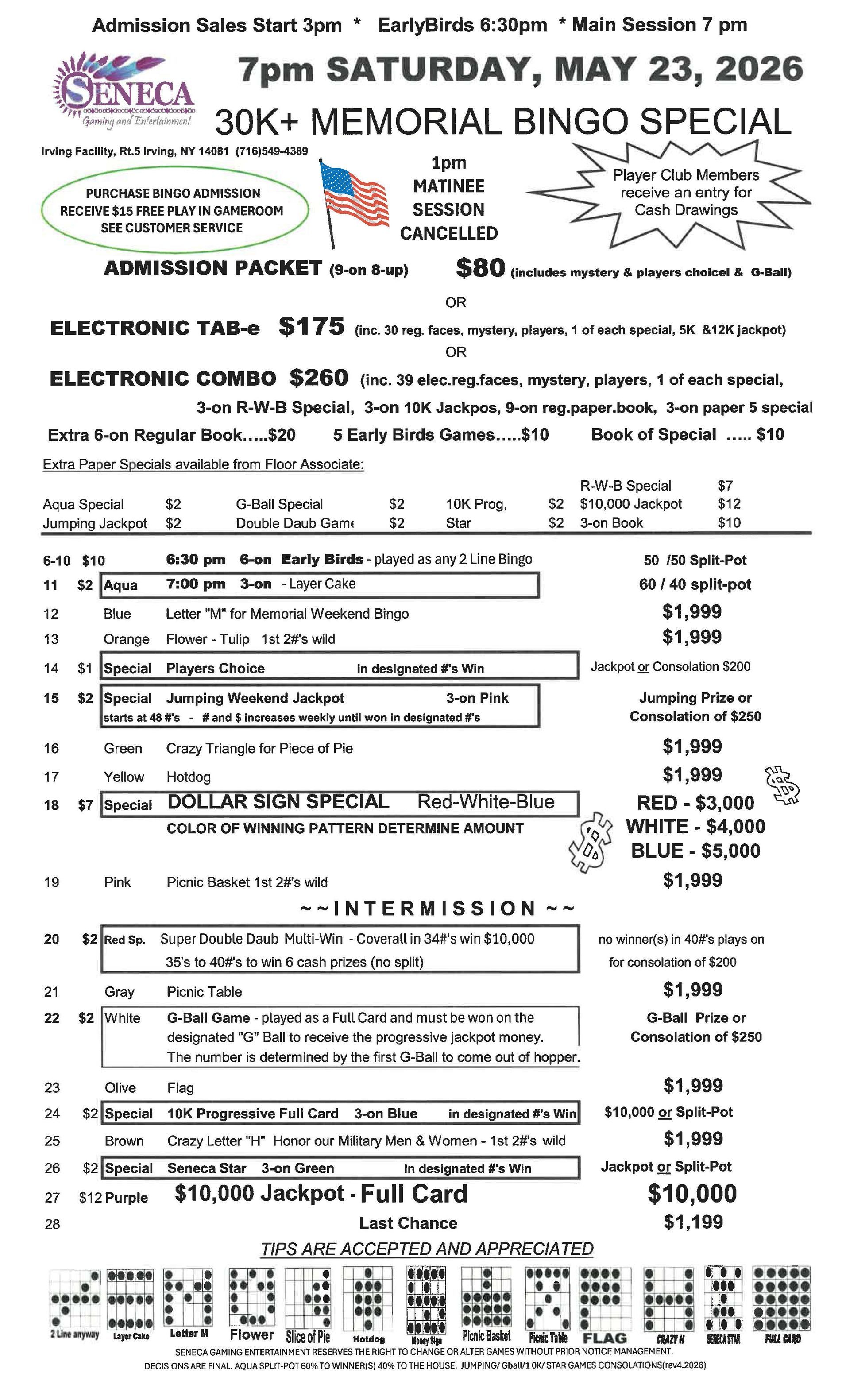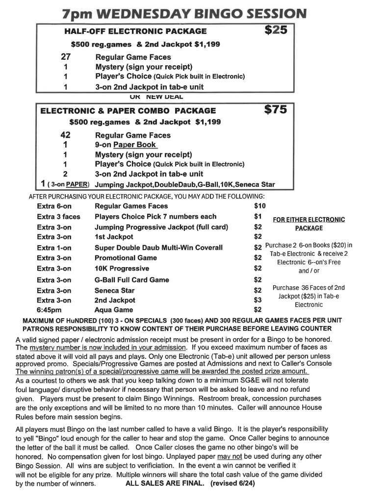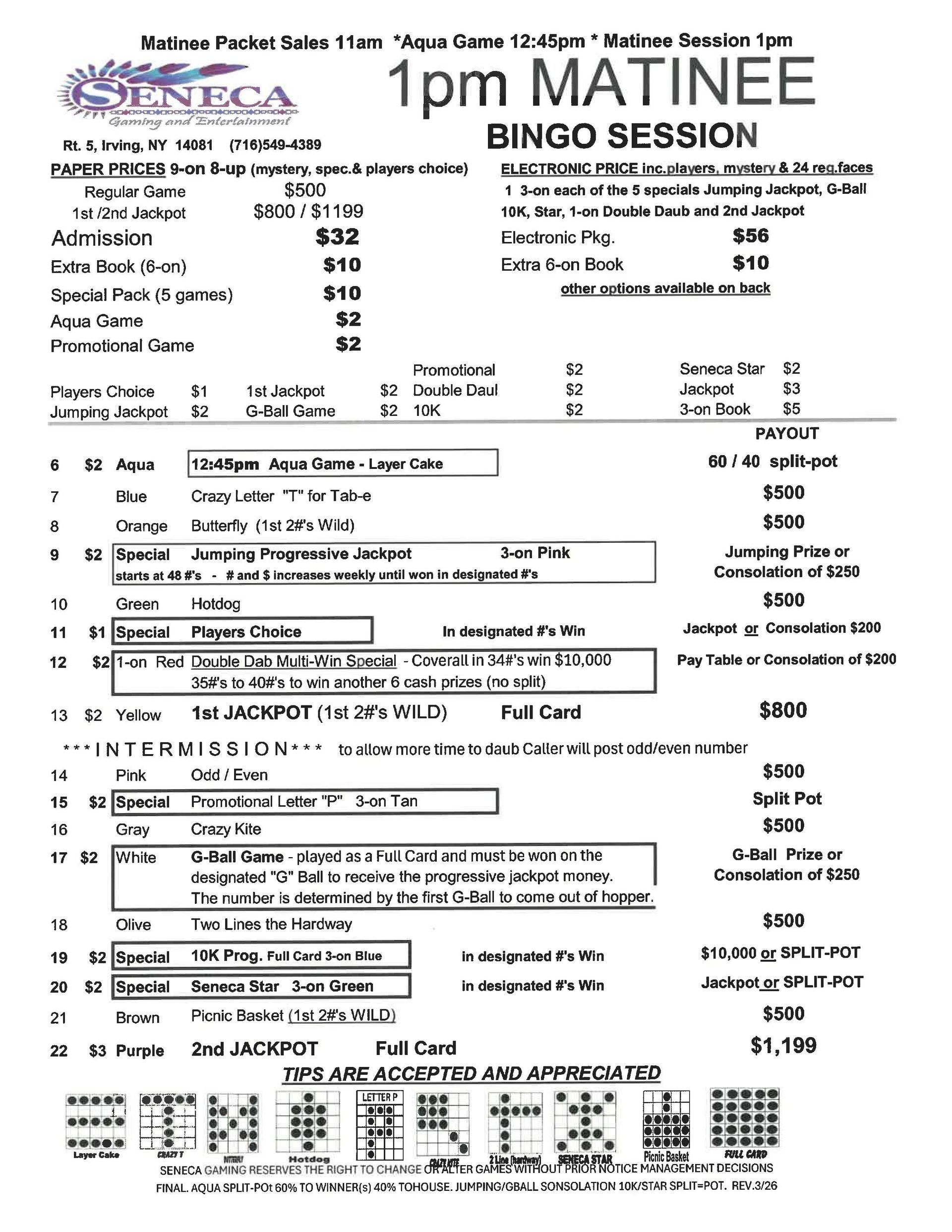 | 1pm & 7pm Wednesday Bingo | $32 Admission | $25 | $500 | $1,199 |