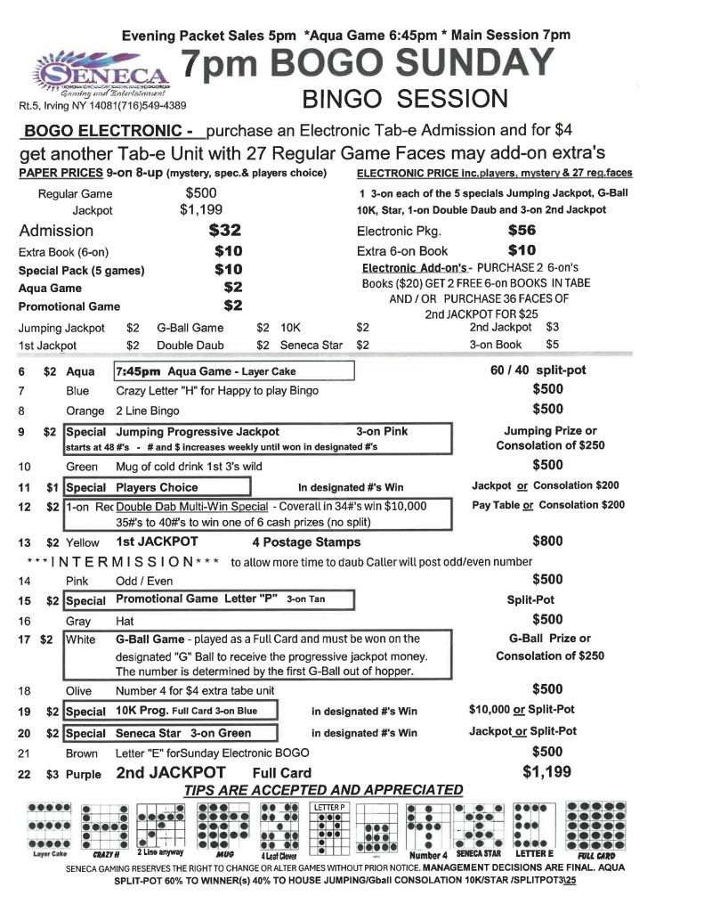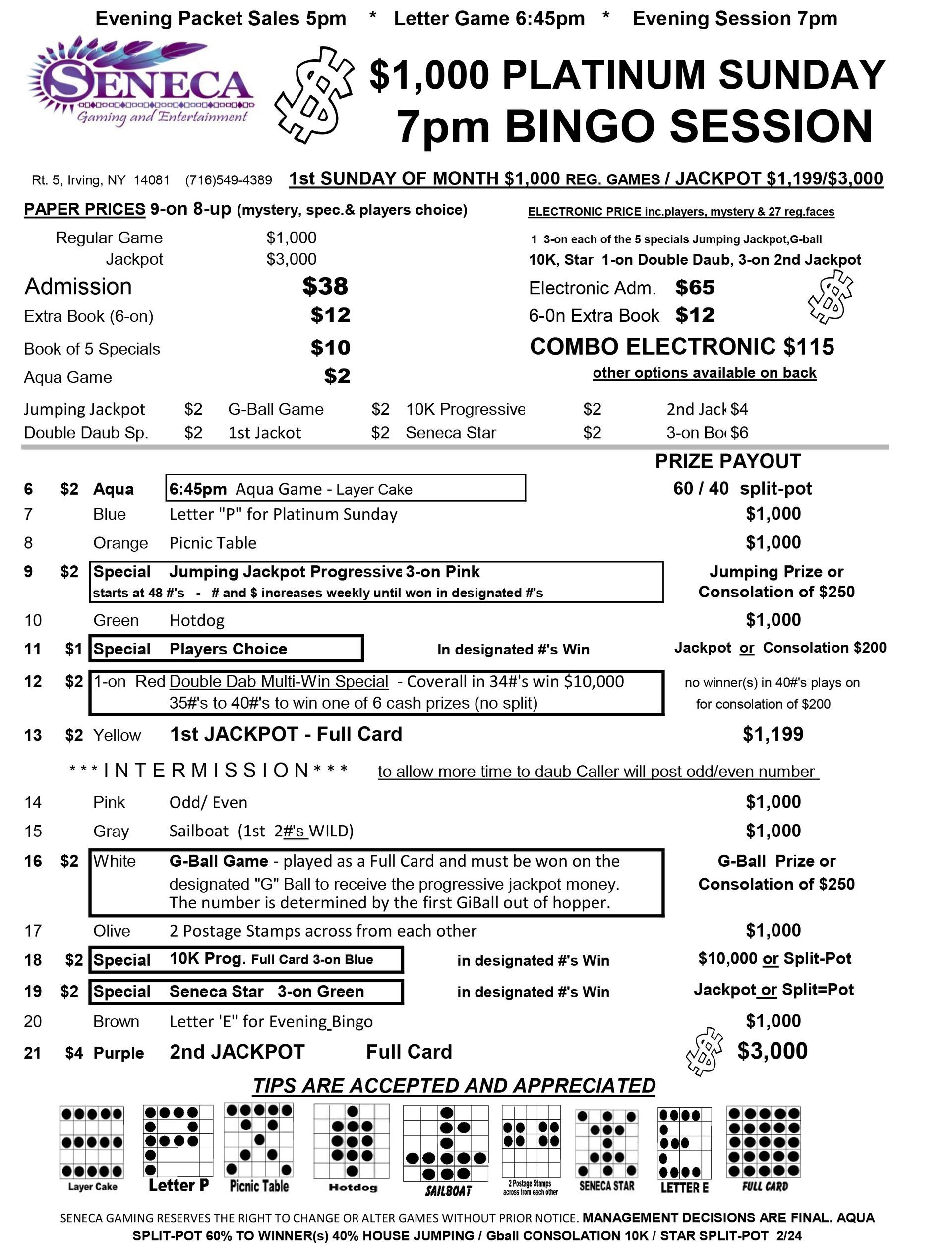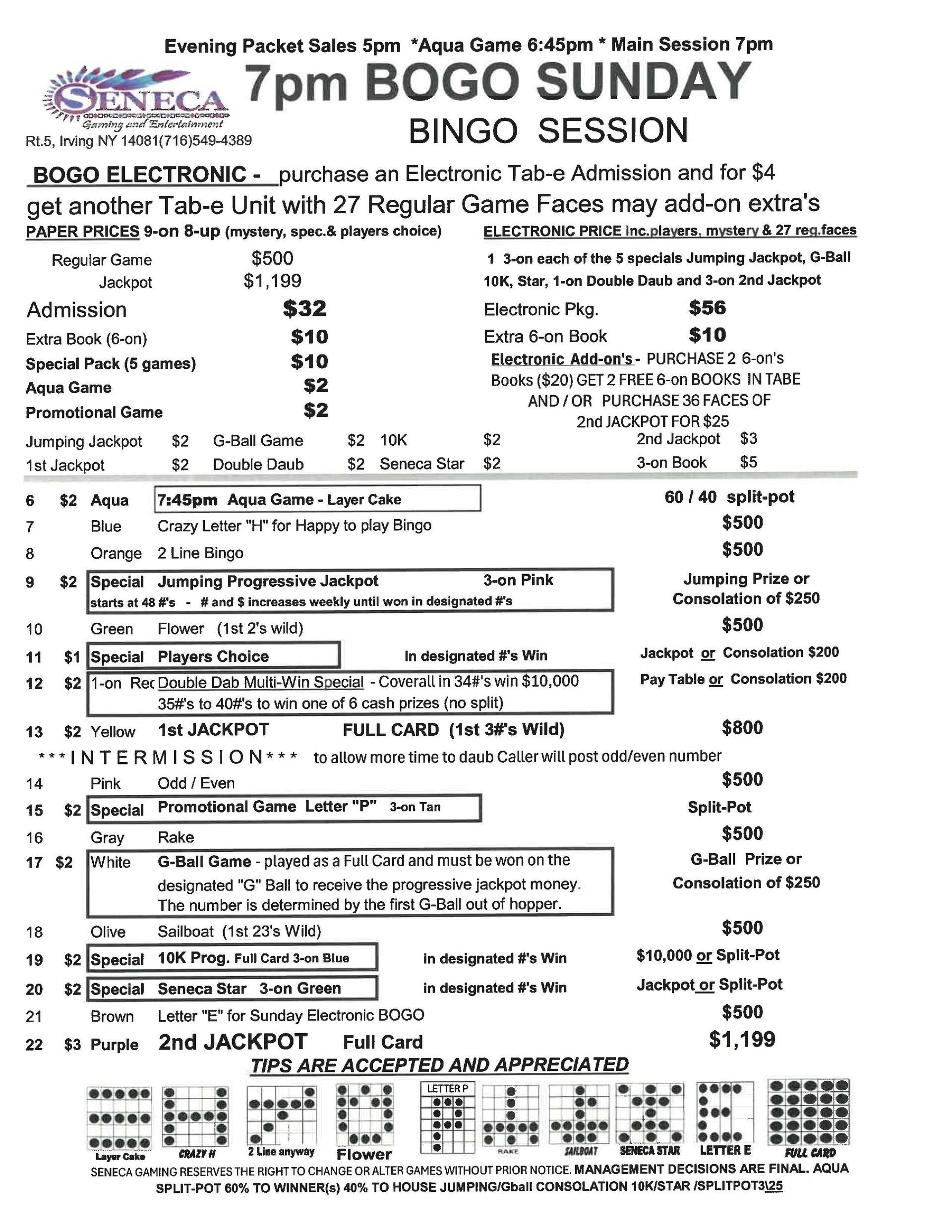 | 7pm Sunday Bingo | $32 Admission | $56 | $500 | $1,199 |