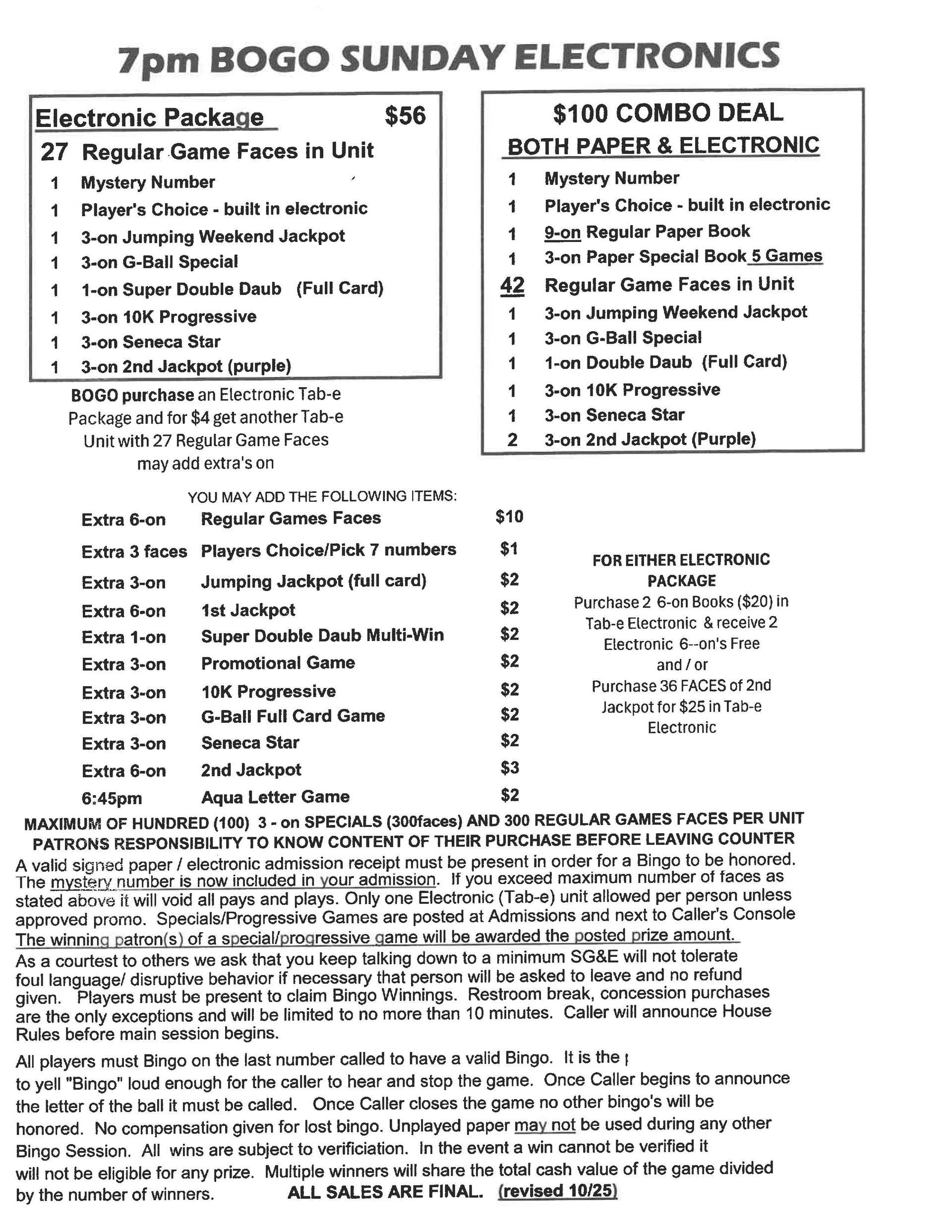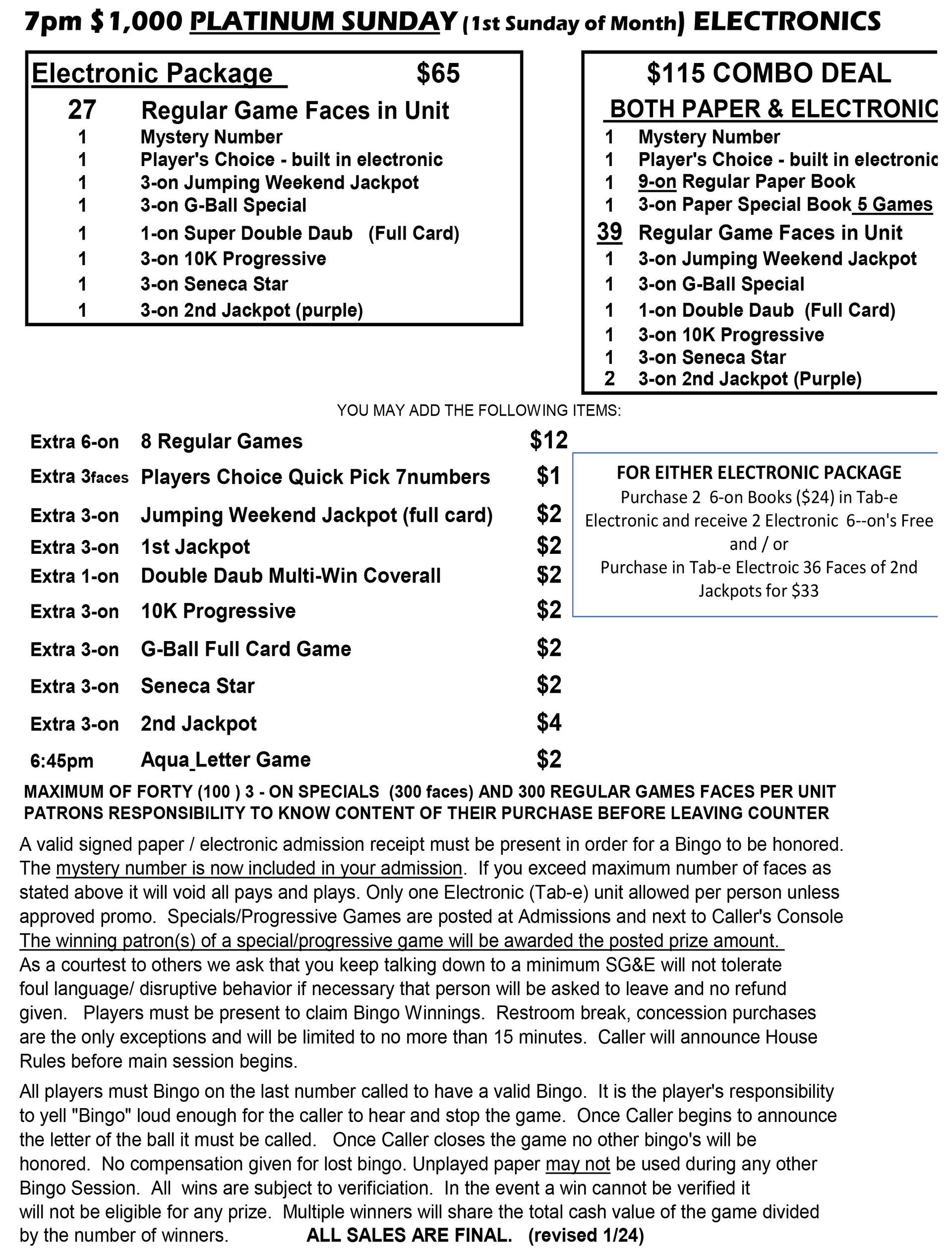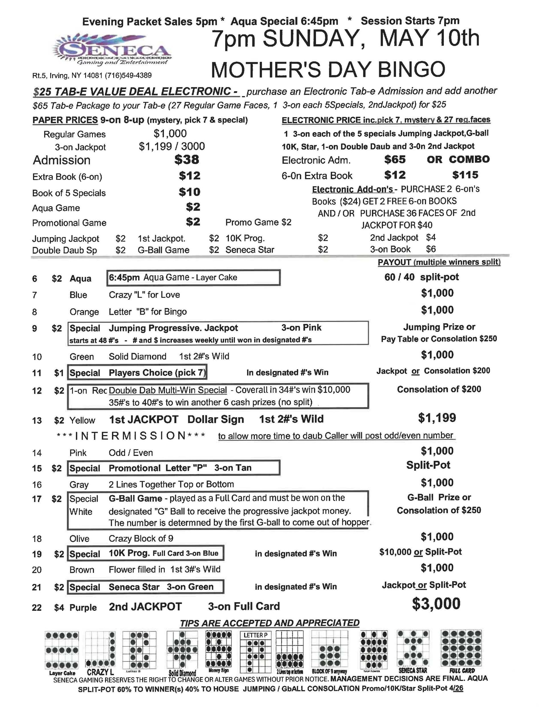 | 7pm Sunday Bingo | $32 Admission | $56 | $500 | $1,199 |