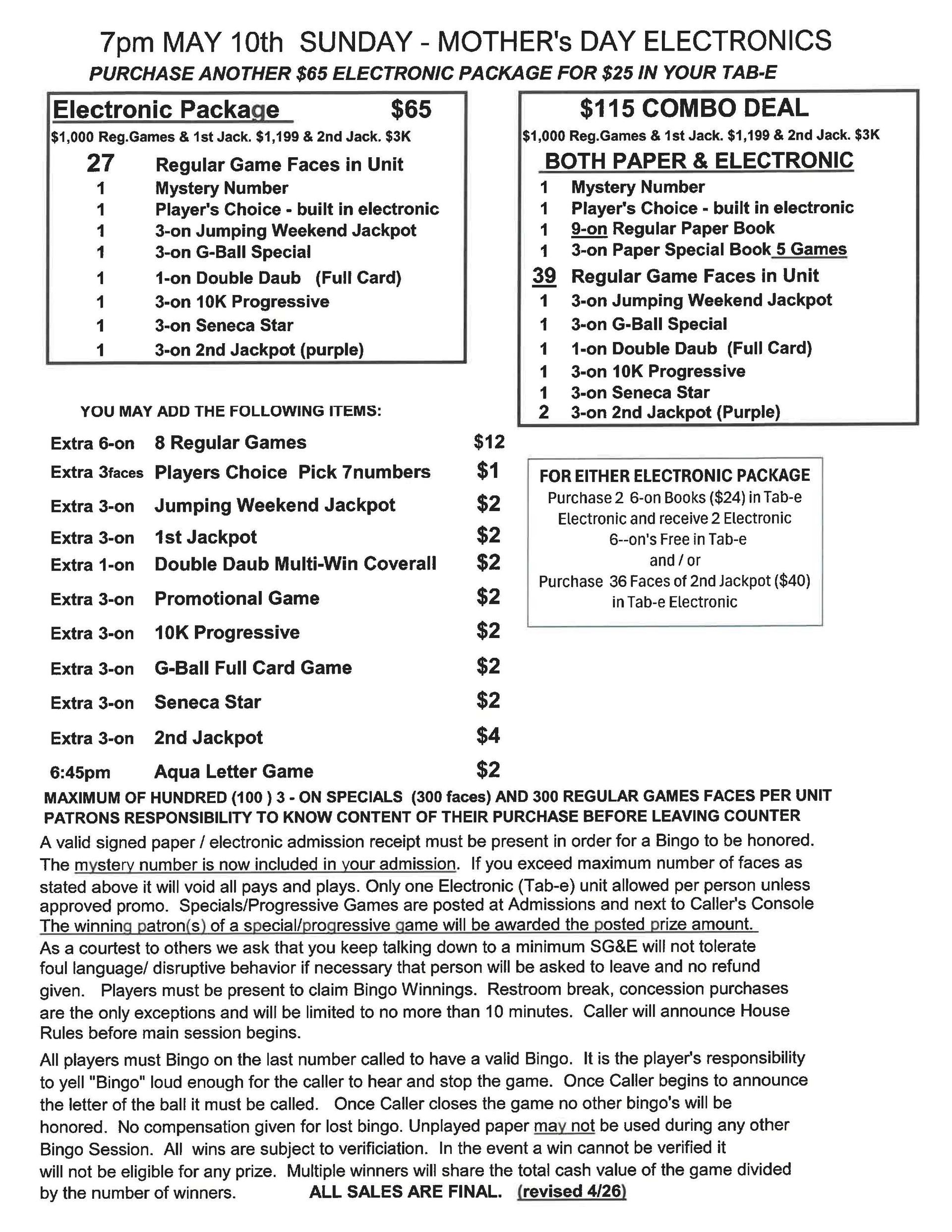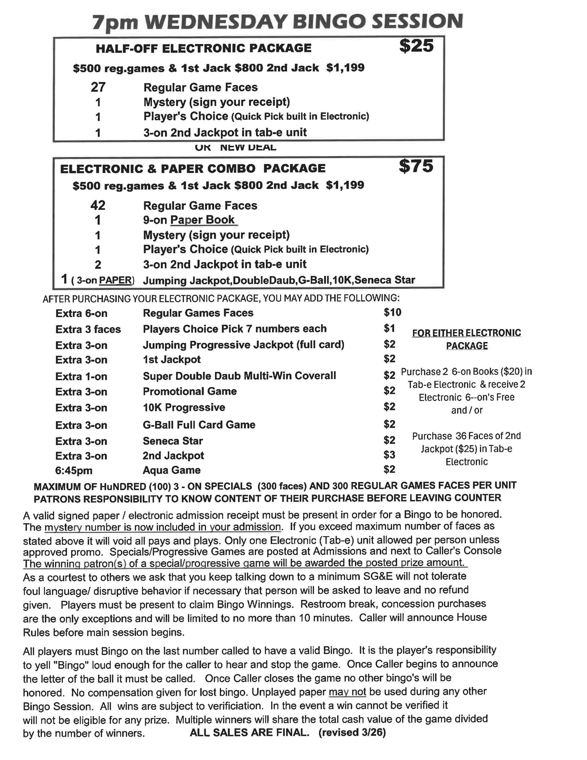 These are bingo games that are optional with your admission. The special games are Usually 3-On singled sheets that may be purchased at Admissions or from a Bingo Floor Associate.